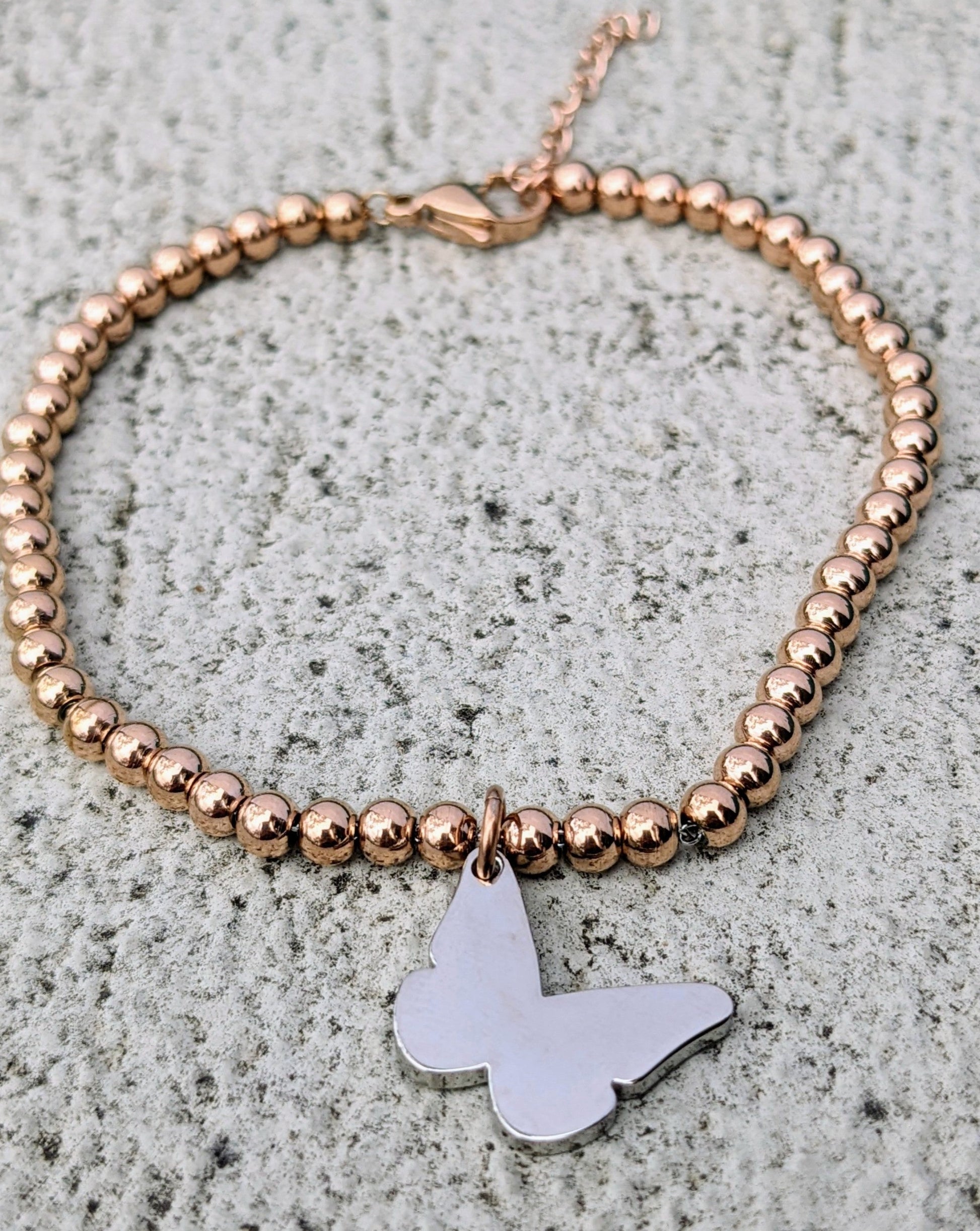 Elevate your everyday style with our stunning Polished Stainless Steel Bead Bracelet. This bracelet is the perfect combination of dainty and bold, featuring 4mm 18ct rose gold-plated beads and a gorgeous 18ct polished steel butterfly Charm that adds a touch of elegance to any look.
