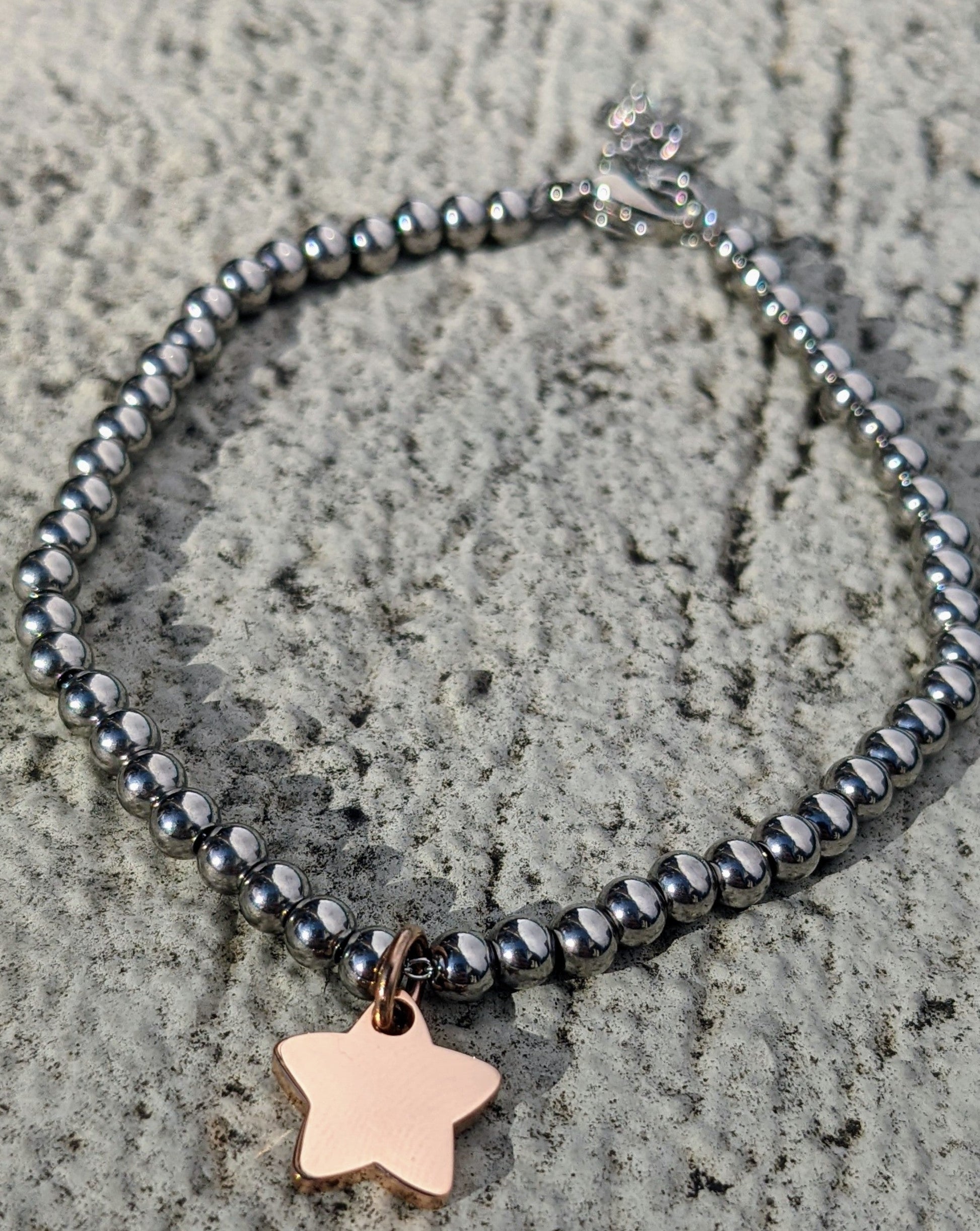 Elevate your everyday style with our stunning Polished Stainless Steel Bead Bracelet. This bracelet is the perfect combination of dainty and bold, featuring 4mm beads and a gorgeous 18ct Rose Gold Plated Star Charm that adds a touch of elegance to any look.