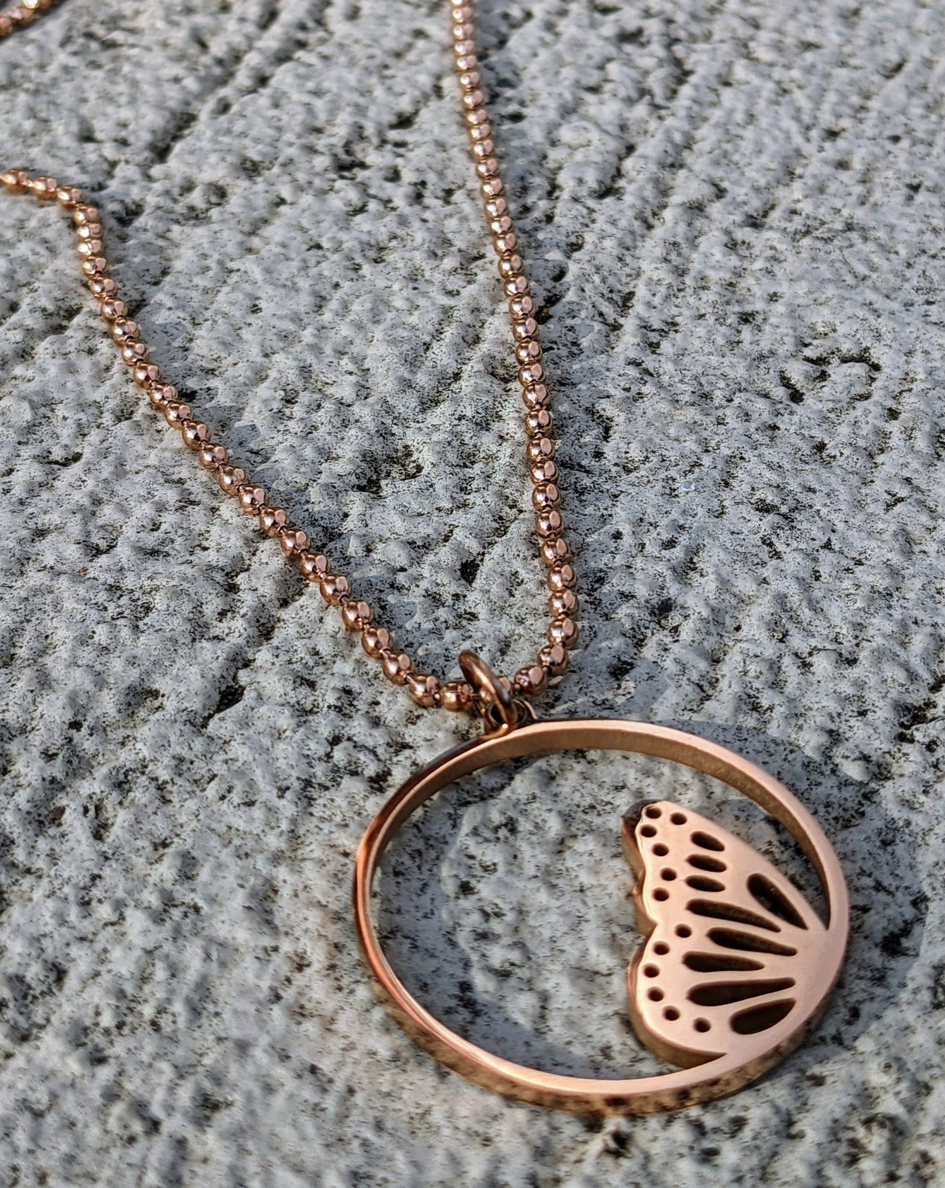 Elevate your jewellery collection with our stunning Stainless Steel Butterfly Wing Charm Necklace, the perfect combination of elegance and durability. This necklace features a beautifully crafted 27mm butterfly wing charm with 18ct rose gold plating that adds a touch of sophistication to any outfit.