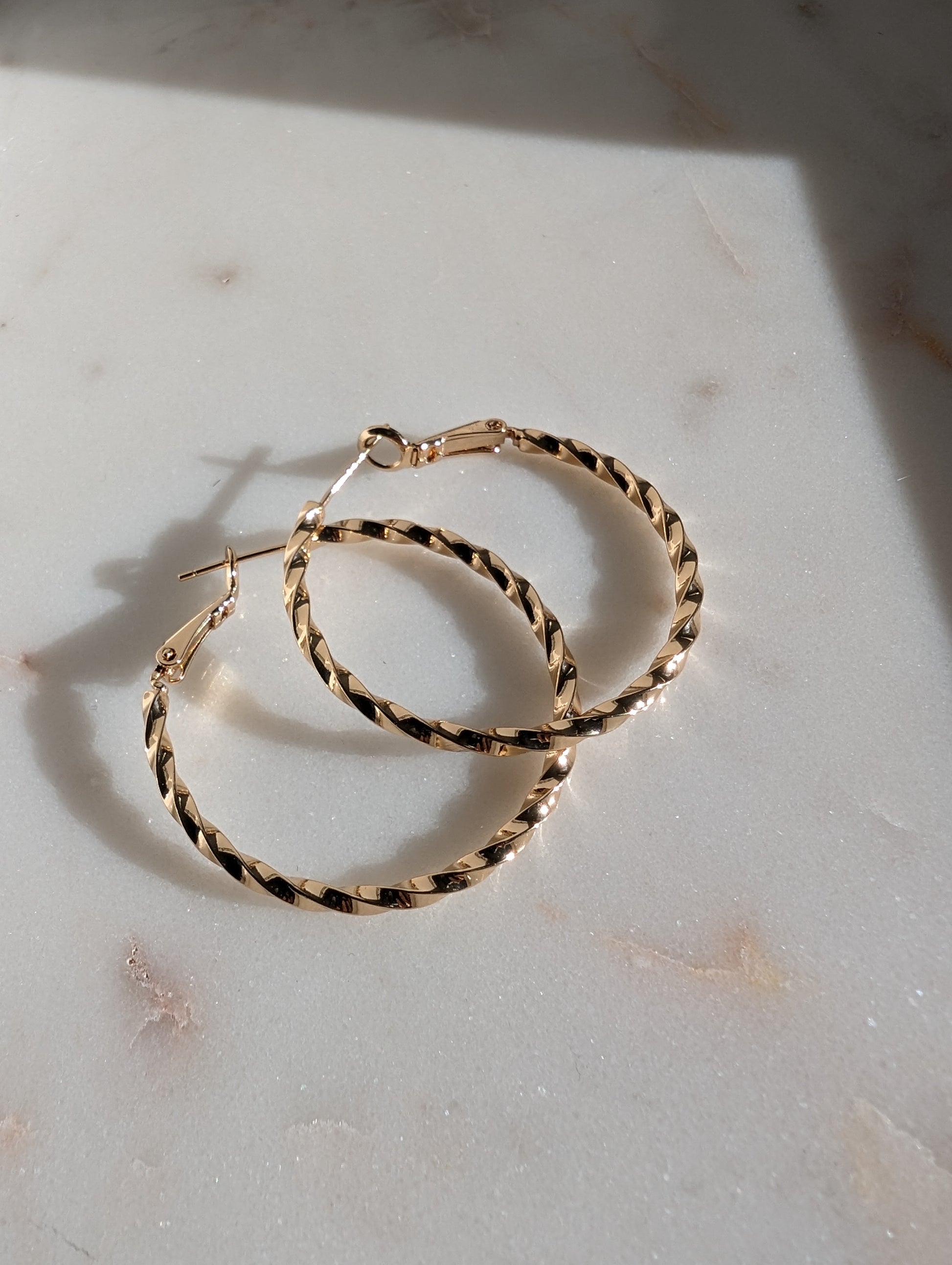 The perfect pair of statement hoop earrings to elevate every look. Seriously, wear them with jeans and a tee, a tailored blazer, or a cocktail dress: these versatile twist hoop earrings can do it all. Crafted in 18k fine gold plating with a rope chain style twisted texture, you can wear them alone or stack them with gold hoops and studs.