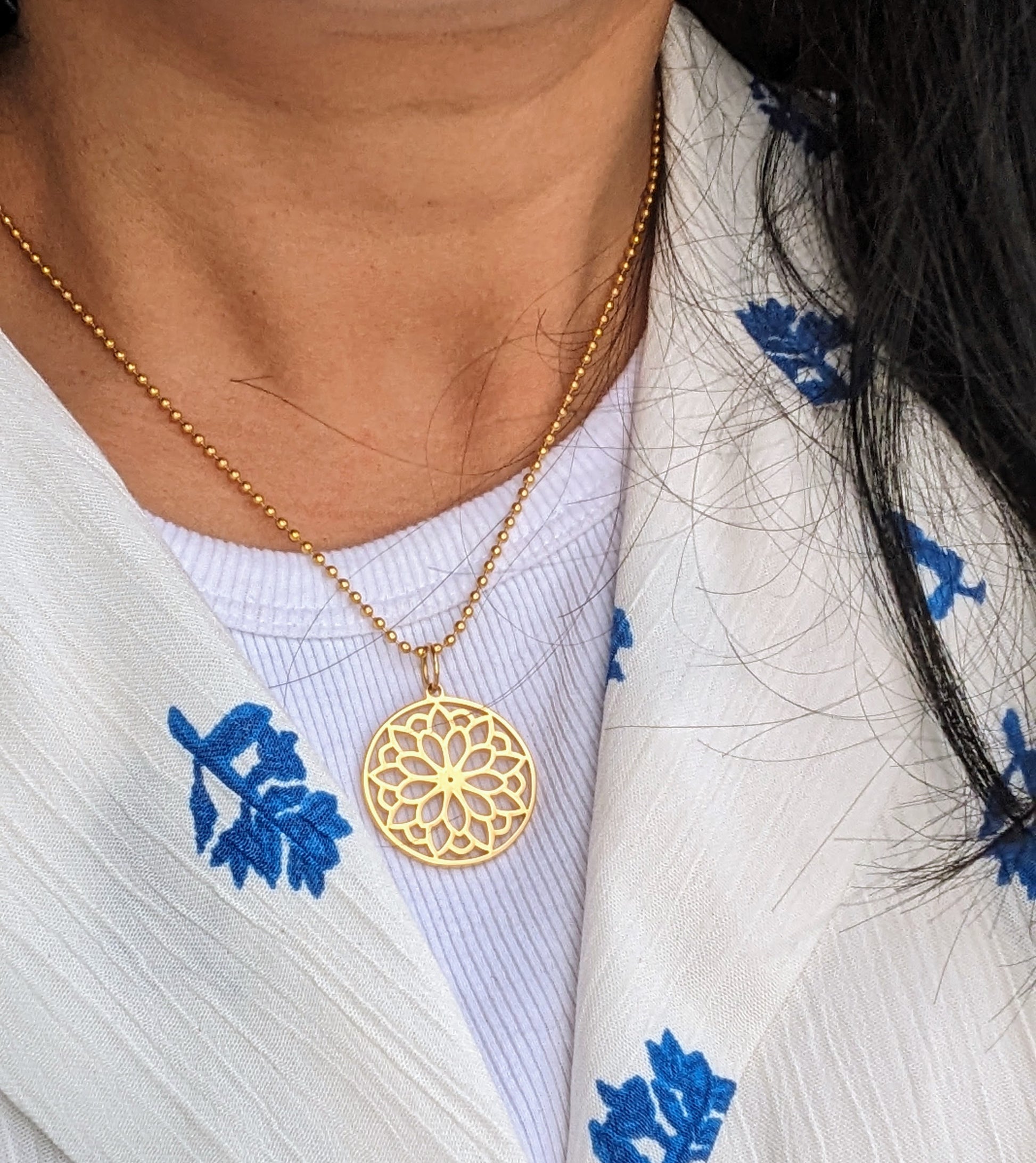 Move forward with love, knowing you are in good hands. This Mandala charm necklace represents empathy and love. A meaningful and thoughtful gift for someone special in your life. With its sleek and sophisticated design, this necklace is the perfect finishing touch to any outfit.