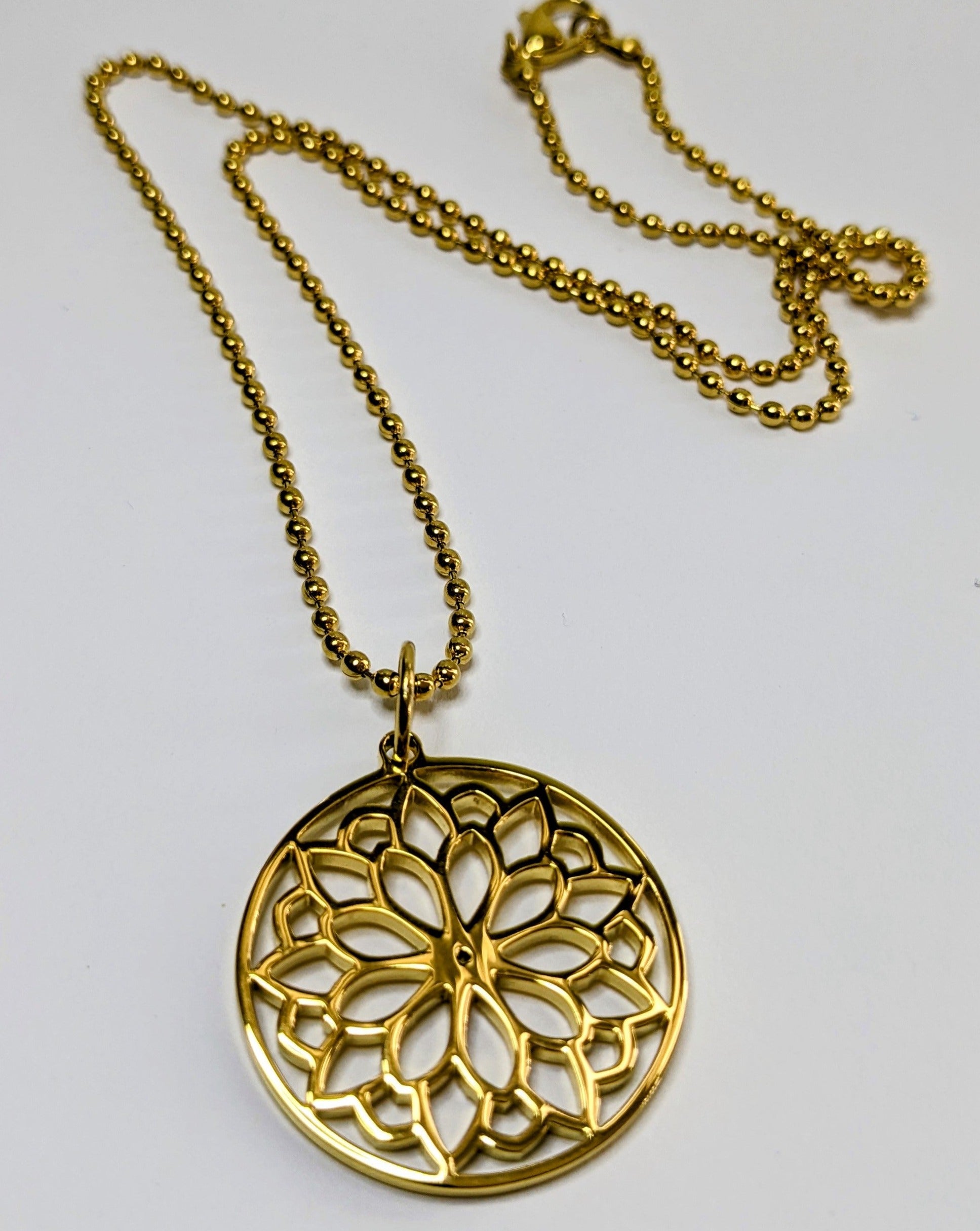 Elevate your jewellery collection with our stunning Stainless Steel Mandala Charm Necklace, the perfect combination of elegance and durability. This necklace features a beautifully crafted 27mm Mandala charm with 18ct gold plating that adds a touch of sophistication to any outfit.