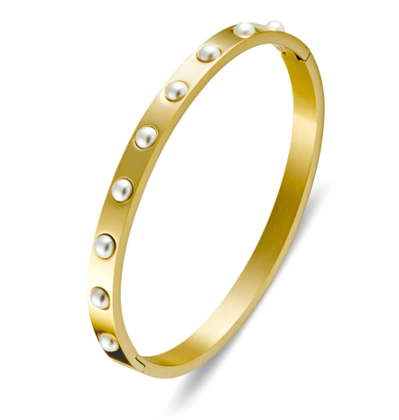 Pearls for the Girls! Crafted in stainless steel, plated in gold and inset with pearls, this cute bangle won't tarnish, dull, or make your arm green! Wear alone or pair it with our Enamel Bracelet to elevate your look.